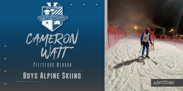 Cameron Watt Award Section V Scholarship Week Of 4/22/2024 Sport Alpine Skiing School Pittsford Mendon Year Senior Position Hometown High School Pittsford Mendon Cameron has been participating on the Alpine Ski Team since 7th Grade. In addition, he participates in cross country and golf. When asked, what will you miss the most about competing in high school interscholastic athletics, Cameron shares he will “miss the teamwork and friends I have made over the years”. After high school, Cameron plans to attend Florida State University to study Economics/Political Science and attend law school after he graduates. Cameron states the one word that best describes him is “curious”.